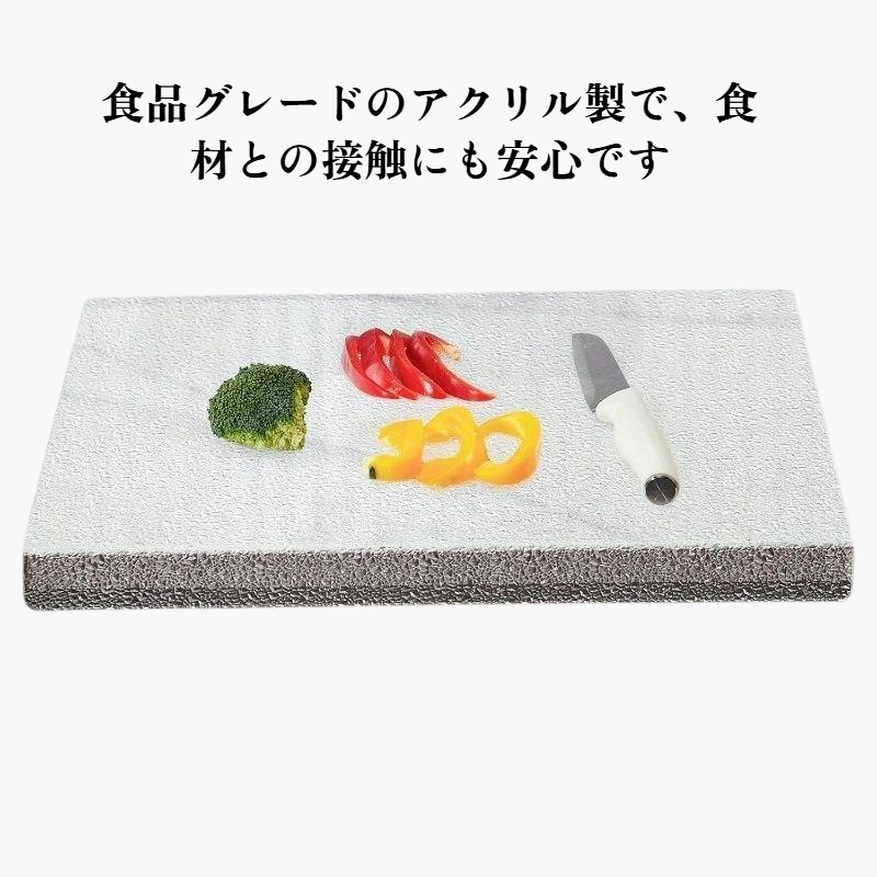ガラス粒アクリルまな板は、耐久性・抗菌性に優れ、傷がつきにくくお手入れ簡単。透明感あるデザインでキッチンに最適。